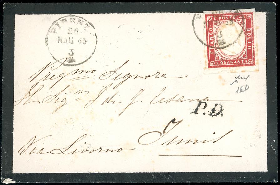 1863 - 40 cent. rosa carminio (16E), nitida doppia stampa, perfetto, su busta da Firenze 26/5/1863 a Tunisi. Chiavarello. Ex coll. Imperato.