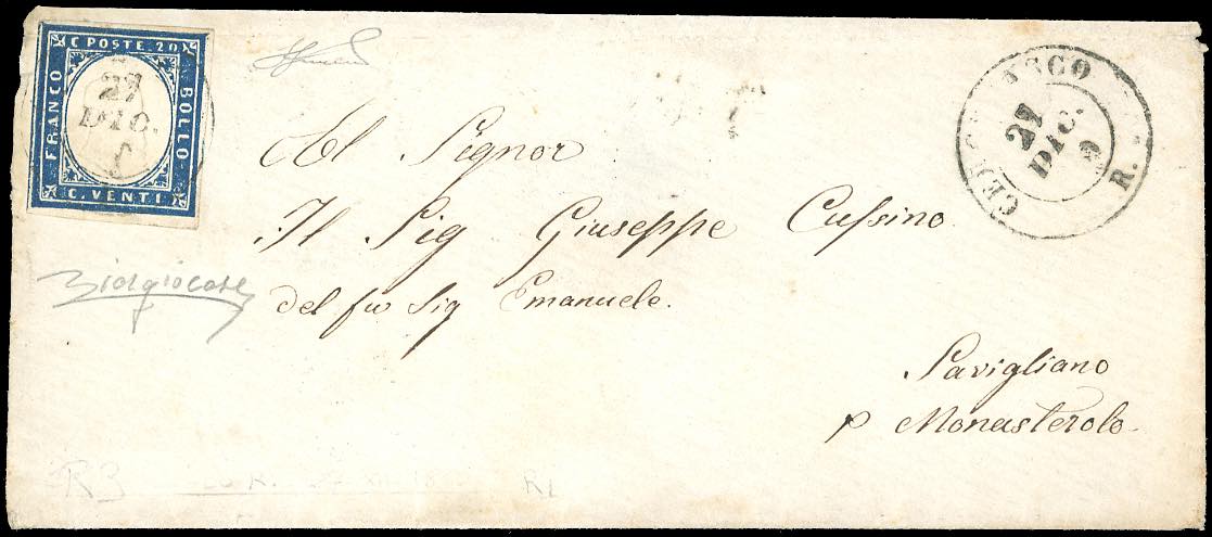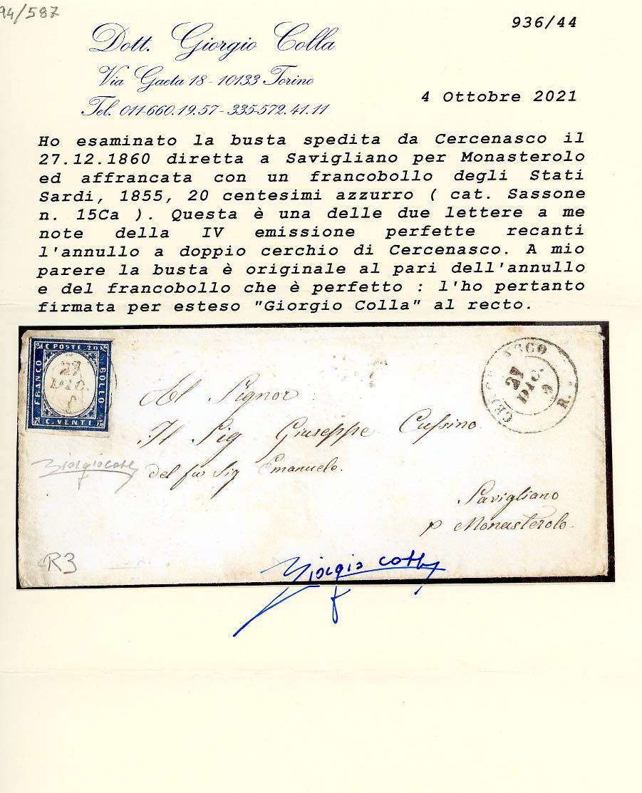 PIEMONTE-CERCENASCO, punti R3 - 20 cent. (15Ca), perfetto, su busta del 27/12/1860 a Monasterolo. UNA DELLE DUE LETTERE NOTE con francobolli perfetti della IV emissione. Rarità degli annullamenti di Sardegna. Ferrario, cert. Colla.