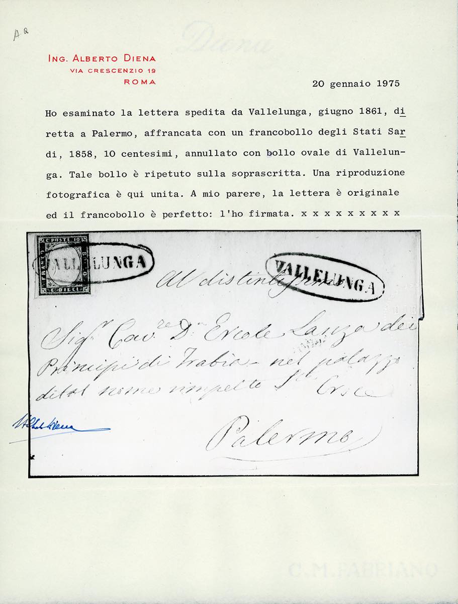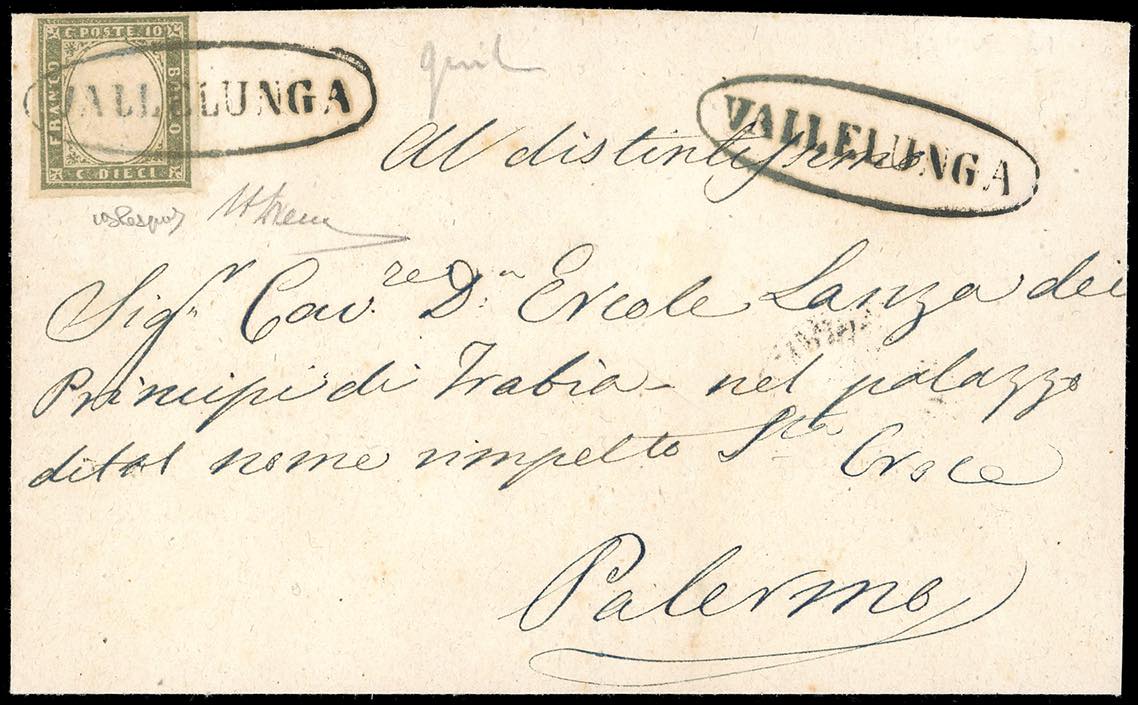 VALLELUNGA, ovale senza fregi punti 13 - 10 cent. (14C), perfetto, su fresca lettera diretta a Palermo, bollo d'arrivo 17/5/1861. Splendida e rara! Probabilmente la più bella nota delle quattro conosciute con tale affrancatura. Cert. A.Diena. Ex coll. Nino Aquila.