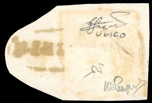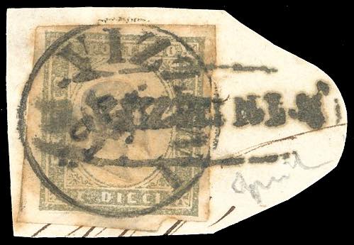VIZZINI, ovale con fregi (punti R2) + cerchio (punti 7), combinazione inedita e non catalogata - 10 cent. (14C), perfetto, usato su frammento con i due bolli coannullatori, borbonico e sardo italiano. Insieme unico. Ferrario, ex collez. Nino Aquila.