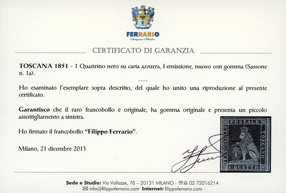 1851 - 1 quattrino nero su azzurro (1a), ottimi margini, minimo punto d'assottigliamento a sinistra, nuovo, gomma originale. Molto fresco, ottimo aspetto. Cert. Ferrario.