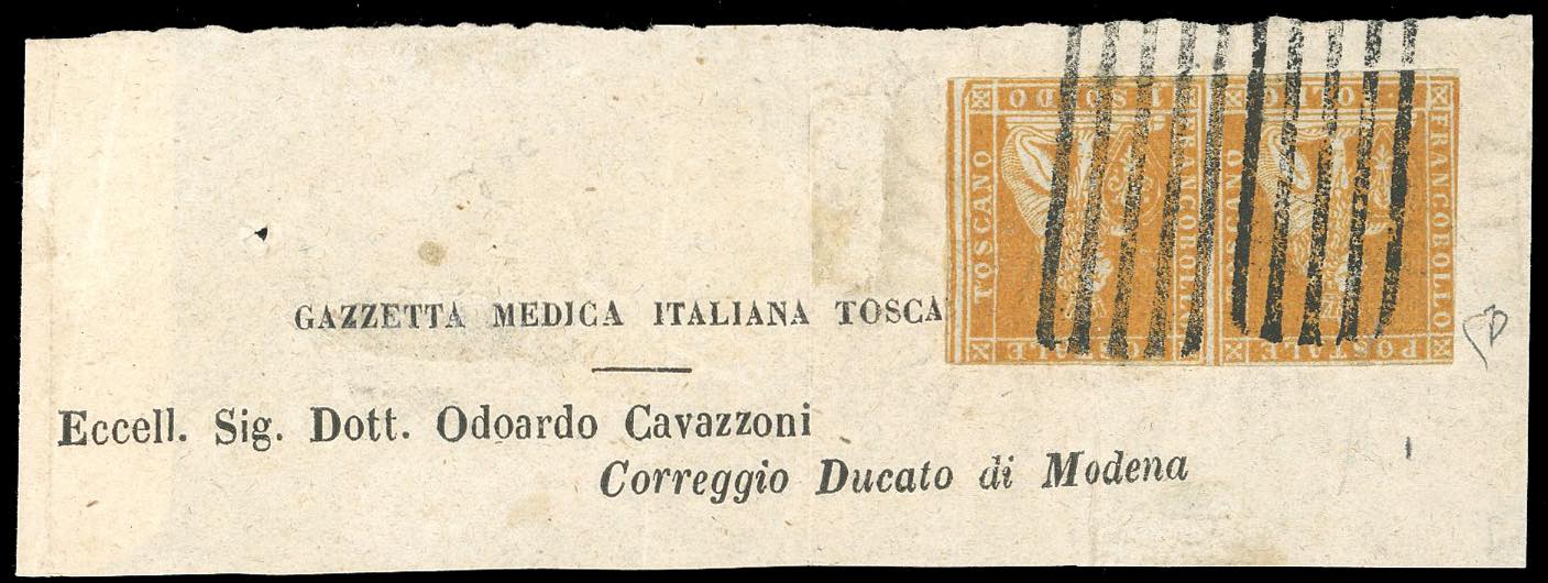 1851 - 1 soldo bistro arancio su grigio (2d), coppia orizzontale, un esemplare con bella varietà di clichè, lievi difetti, annullata con il bollo a cinque sbarre di Firenze, su fresca fascetta della Gazzetta Medica Italiana Toscana per Correggio, nel Ducato di Modena. Tariffa di 2 soldi ed affrancatura estremamente rare. Cert. Raybaudi ed E.Diena.