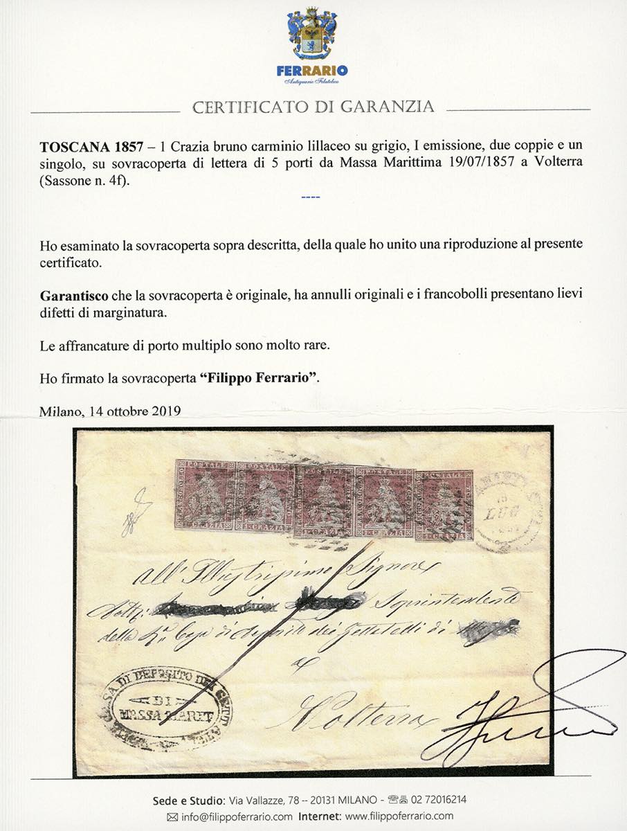 1857 - 1 crazia bruno carminio lillaceo su grigio (4f), due coppie e un singolo, lievi difetti di marginatura, su lettera di cinque porti in tariffa ridotta per uffici governativi da Massa Marittima 19/7/1857 a Volterra. Affrancatura e porto multiplo di cinque crazie estremamente rari, due sole lettere note. Cert. Ferrario.