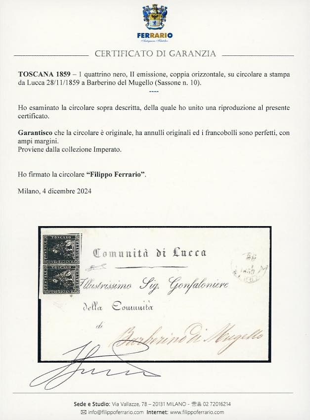 1859 - 1 quattrino nero, II emissione (10), coppia perfetta con ampi margini, su circolare a stampa da Lucca 28/11/1859 a Barberino del Mugello. Insieme molto fresco e di ottima qualità, impreziosito dell'uso durante il Governo Provvisorio. A.Diena, cert. Ferrario. Ex coll. Imperato.