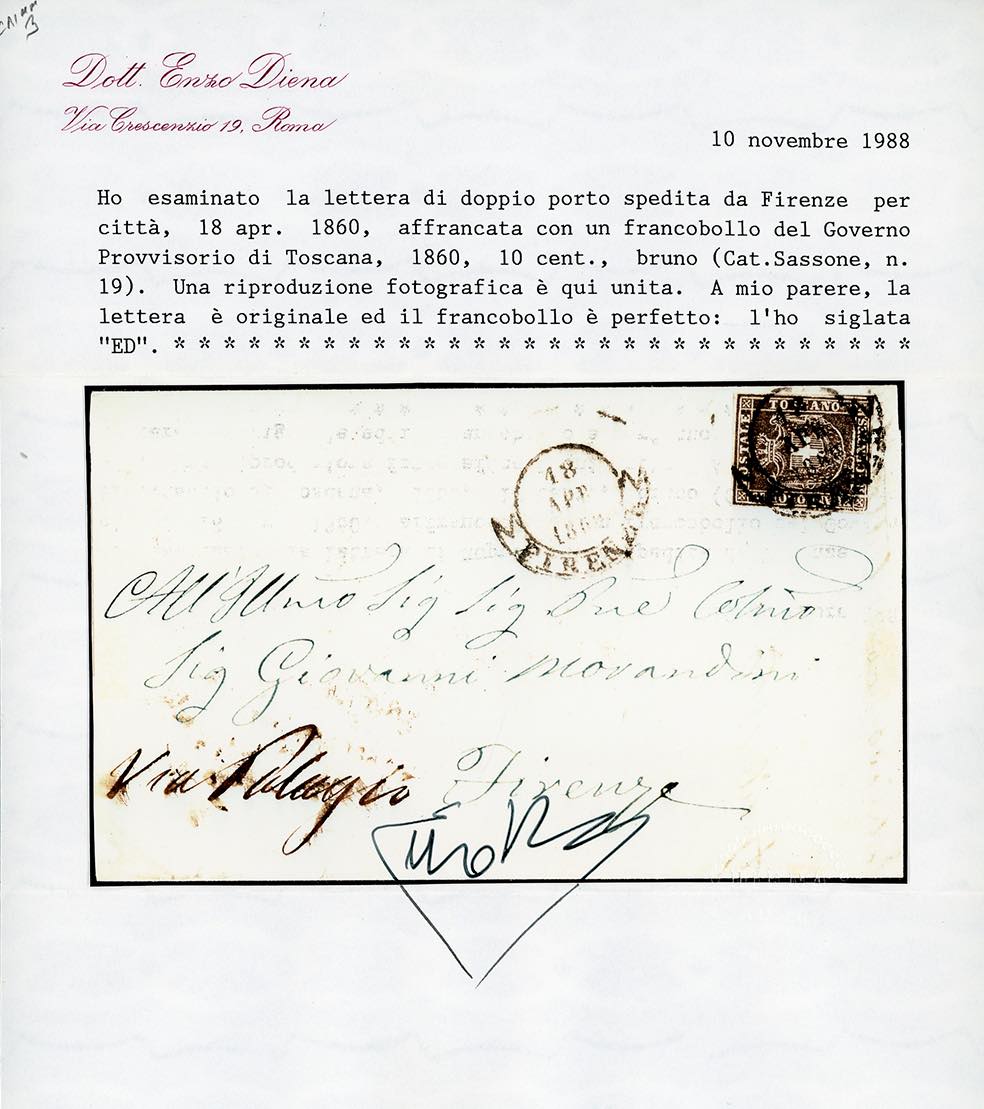 1860 - 10 cent. bruno (19), perfetto e ben marginato, isolato su lettera di doppio porto da Firenze 18/4/1860 per città. Porto multiplo per città molto raro, di ottima qualità. Cert. E.Diena.