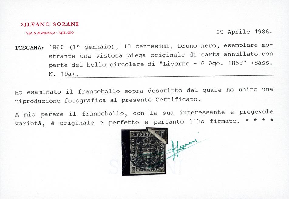 1860 - 10 cent. bruno nero (19a), evidente pli d'accordeon nell'angolo superiore destro, perfetto, usato a Livorno. Interessante varietà di grande impatto visivo, rara così evidente ed ampia. Ferrario, cert. Sorani.