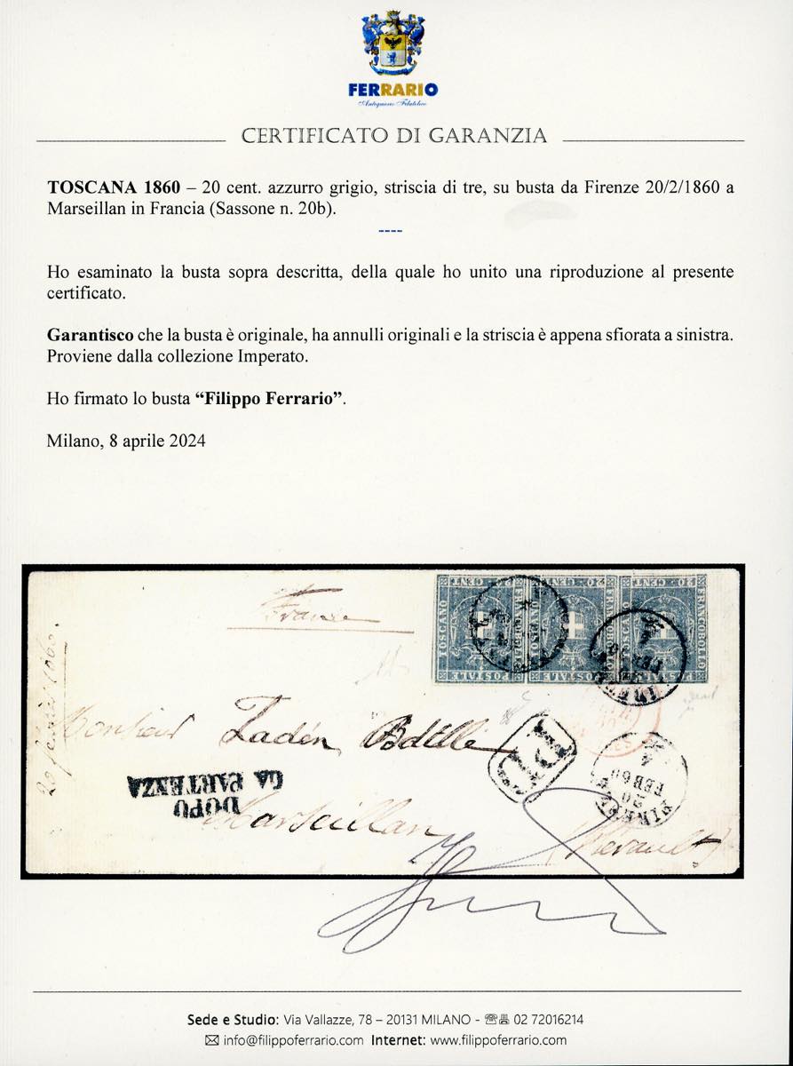 1860 - 20 cent. azzurro grigio, striscia di tre (20b), appena sfiorata a sinistra, su fresca bustina da Firenze 20/2/1860 a Marseillan in Francia. Molto fresca e non comune. A.Diena, Chiavarello, cert. Ferrario.
