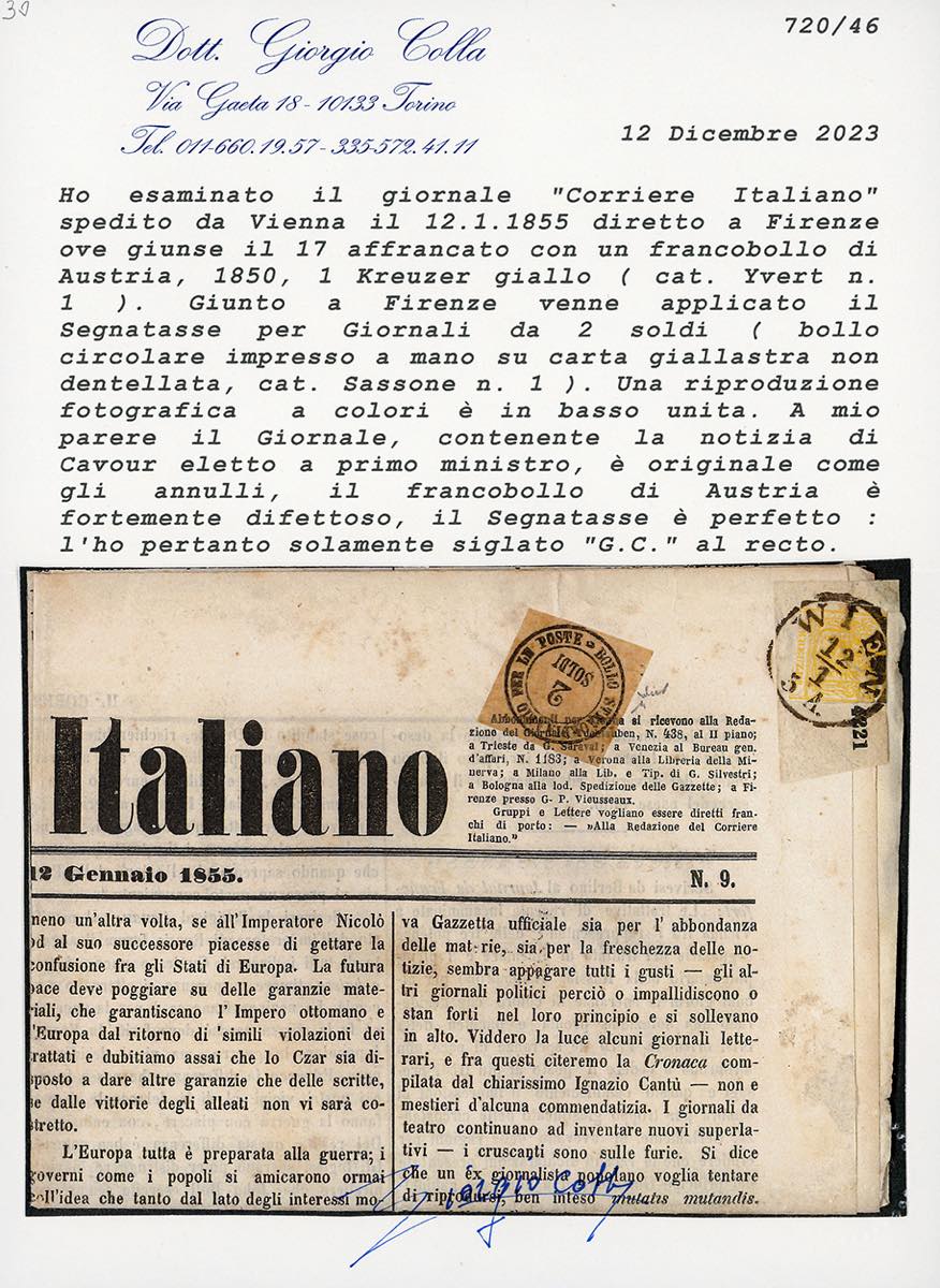 1855 - 2 soldi nero (1), perfetto, applicato in arrivo su copia completa del giornale "Corriere Italiano" del 12/1/1855 affrancato con 1 kr. giallo di Austria (1), difettoso, spedito da Vienna 12/1/1855 a Firenze 17/1/1855, bollo d'arrivo. Insieme probabilmente unico. Chiavarello, cert. Colla. Ex coll. Imperato.