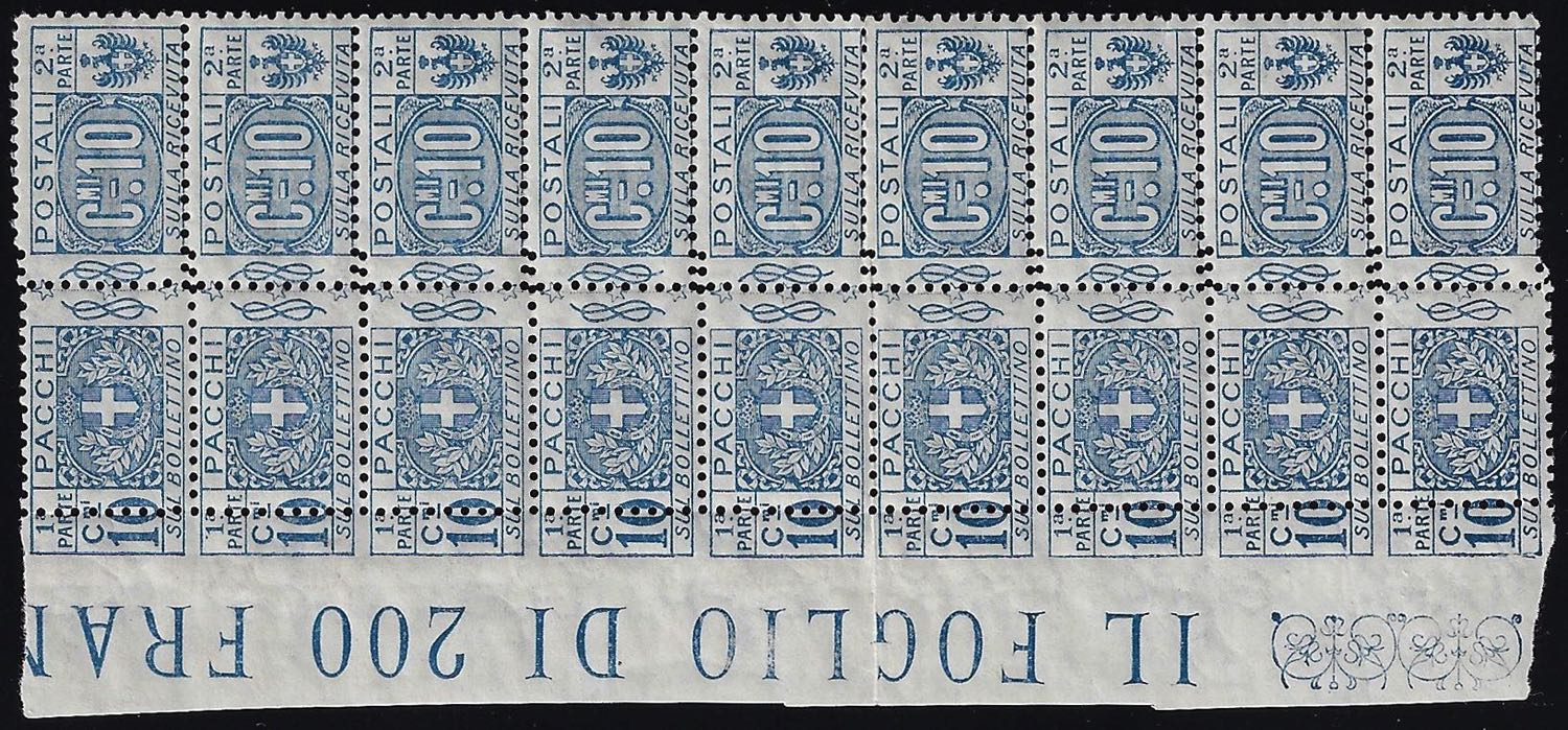 1914 - 10 cent. nodo di Savoia al centro (8), striscia verticale di 9, dentellatura sinistra fortemente spostata a destra, bordo di foglio, ... Leggi tutto