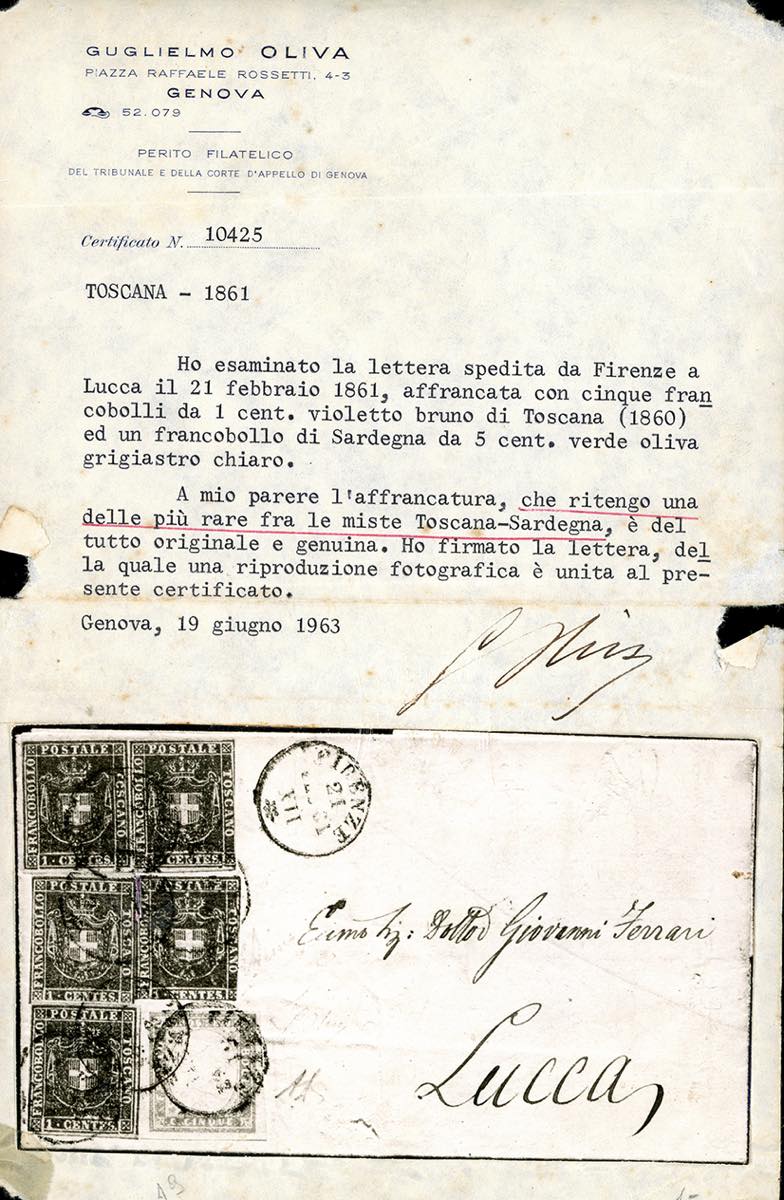 1861 - 1 cent. violetto bruno (17), cinque esemplari di tinte differenti, difetti di marginatura, in affrancatura mista con 5 cent. verde oliva grigiastro chiaro, IV emissione di Sardegna (13Bd), perfetto e con grandi margini , su lettera da Firenze 21/2/1861 a Lucca. Si tratta certamente di una delle più rare combinazioni in affrancatura mista con i francoblli del Governo Provvisorio di Toscana. INSIEME UNICO!