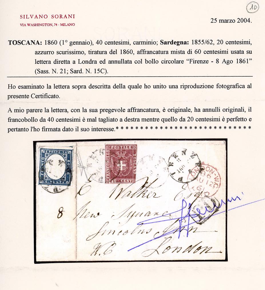 1861 - 40 cent. carminio, corto a destra, in affrancatura mista con 20 cent. azzurro scurissimo IV emissione di Sardegna, perfetto e ben marginato (15C), su lettera da Firenze 8/8/1861 a Londra. Interessante destinazione. Cert. Sorani.