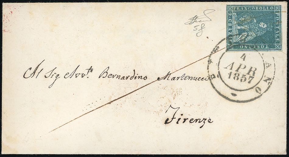 PITIGLIANO, doppio cerchio grande (punti 6) + penna non catalogato - 2 crazie (5f), leggermente intaccato a sinistra, su busta del 4/4/1857 ... Leggi tutto
