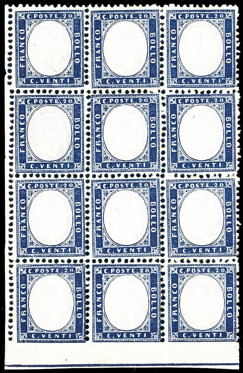 1862 - 20 cent. indaco, blocco di 12 esemplari, i tre inferiori non dentellati in basso e bordo di foglio con linea di riquadro (2l.2), nuovo, gomma originale integra, perfetto. Molto fresco. Ferrario.