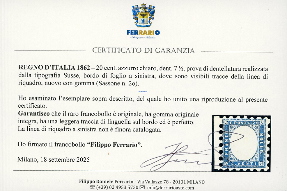 1862 - 20 cent. azzurro chiaro, prova di dentellatura 7 1/2 eseguita dalla tipografia Susse (2o), bordo di foglio a sinistra, dove sono visibili tracce della linea di riquadro, nuovo, gomma originale integra, leggera traccia di linguella solo sul bordo, perfetto. Ad oggi non è catalogata la linea di riquadro a sinistra. Esemplare probabilmente unico. E.Diena, Sorani, cert. Ferrario.