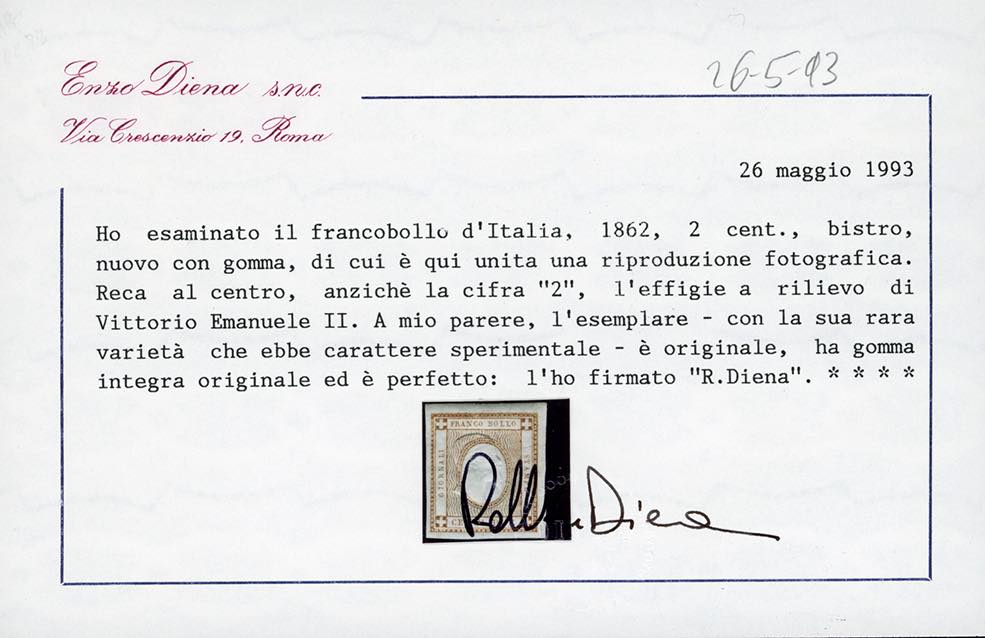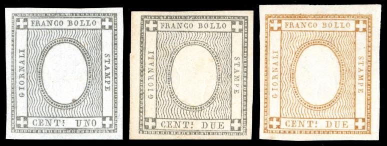 1861/62 - 1 e 2 cent. grigio nero e 2 cent. bistro, i tre valori per stampati di Sardegna e Regno, con l'EFFIGIE al posto della cifra, francobolli sperimentali (10S, Sard.19S,20S), gomma originale integra, perfetti. Bellissimi. Cert. Diena e Finanziario Bolaffi 80%.