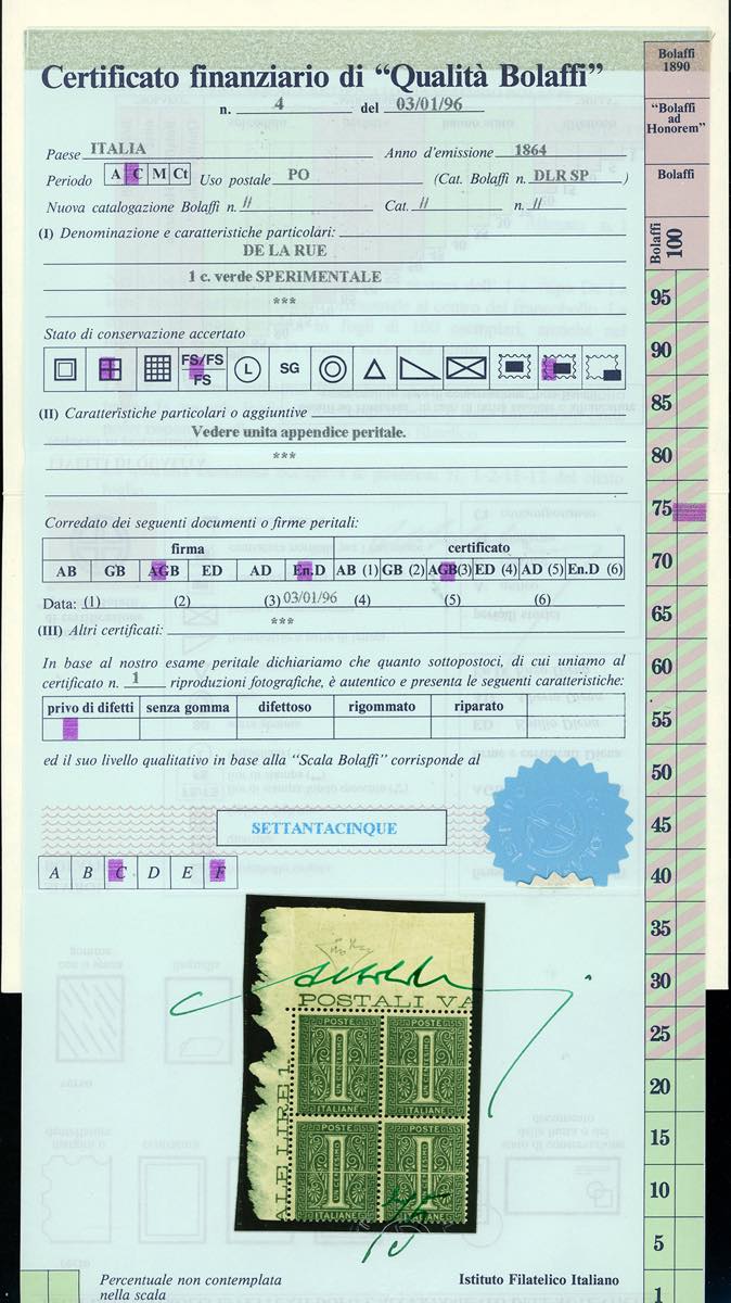 1864 - 1 cent. verde grigio chiaro De La Rue, FRANCOBOLLO SPERIMENTALE con tratto bianco orizzontale al centro, TIRATURA DI LONDRA (L14S), angolo di foglio, buona centratura per l'emissione, nuovo, gomma originale integra, perfetto. Il francobollo, in posizione n. 1 dell'unico foglio di 100 esemplari noto, presenta il tratto orizzontale più sottile, che è posto al centro tra le lettere "n" e "t" di "centesimo" senza sovrapporsi. Estremamente raro e di grande freschezza. Cert. Finanziario Bolaffi (75%) del blocco di quattro di provenienza, fotocopia del cert. E.Diena dell'unico foglio noto, cert. Ferrario.
