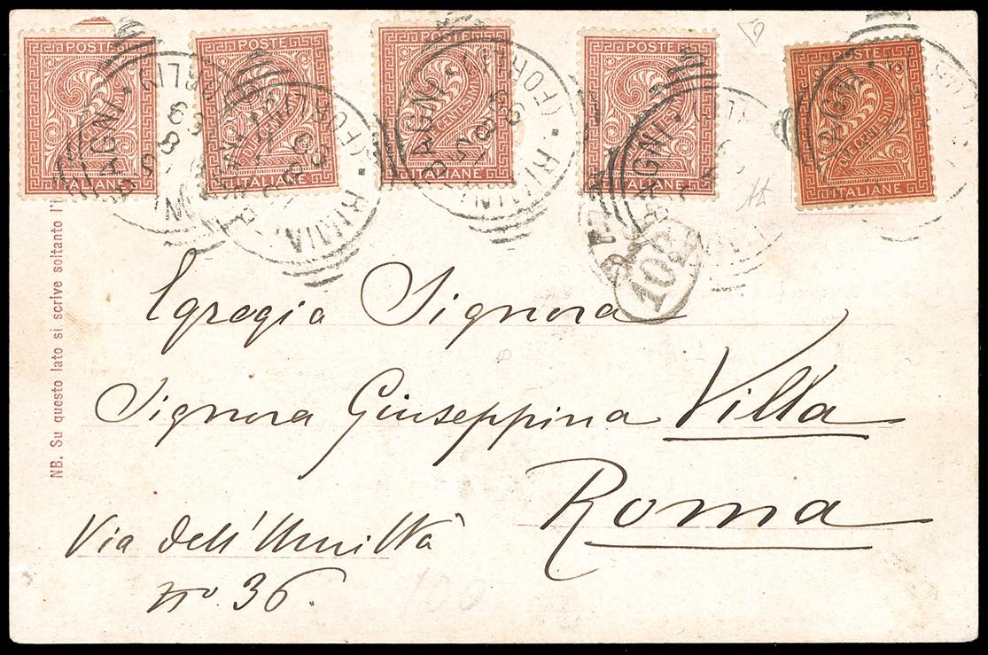 1899 - 2 cent. De La Rue, tiratura di Torino (T15), cinque esemplari, di cui uno di colore nettamente diverso, quattro perfetti ed uno difettoso, su cartolina illustrata di San Marino inviata da Rimini Bagni 15/8/1899 a Roma. Interessante. E.Diena.