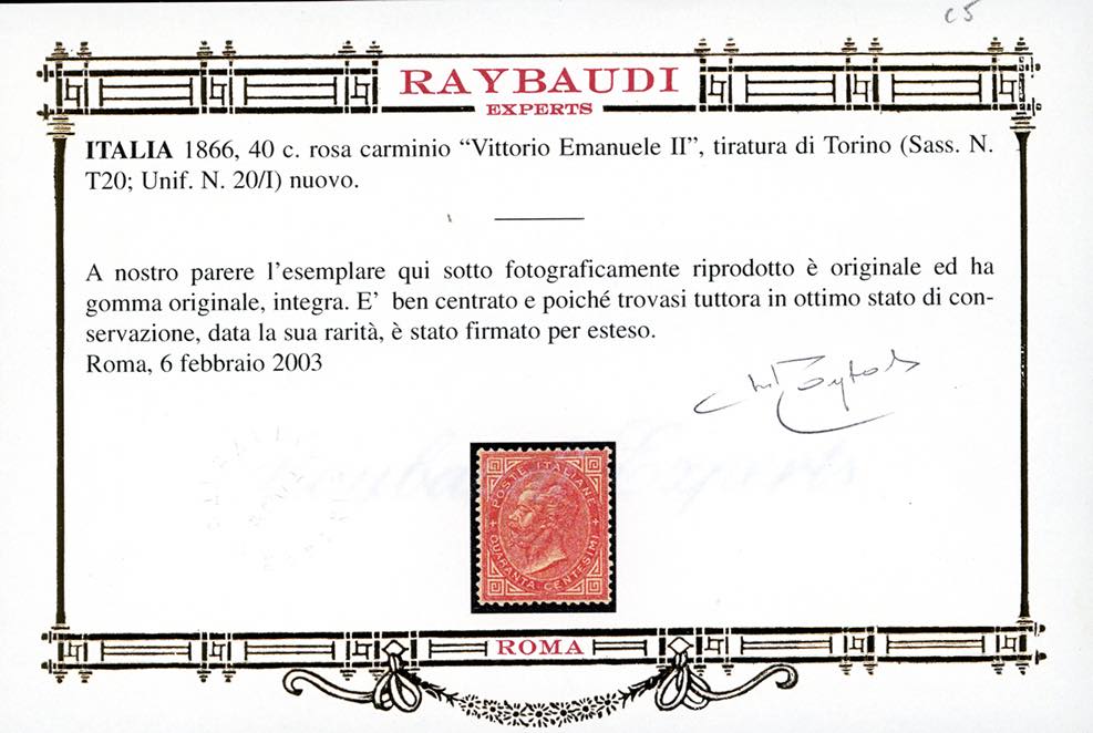1866 - 40 cent. rosso carminio, De La Rue, tiratura di Torino (T20), ottima centratura, nuovo, gomma originale integra, perfetto. Raro. A.Diena, cert. Oro Raybaudi.
