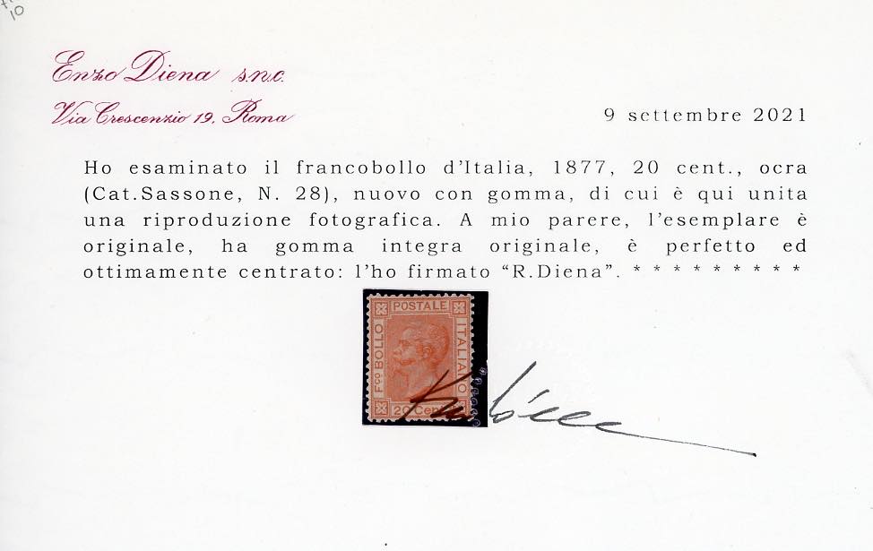 1877 - 20 cent. ocra arancio (28), nuovo, gomma originale integra, perfetto. Freschissimo e ben centrato. A.Diena, Sorani. Cert. Diena e ... Leggi tutto