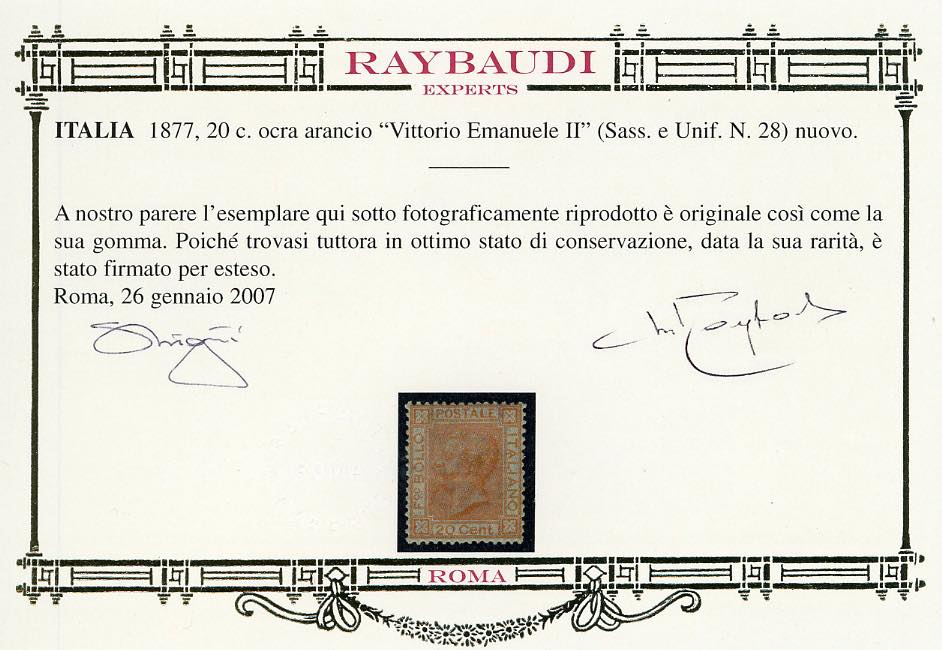 1877 - 20 cent. ocra arancio (28), nuovo, gomma originale, leggera traccia di linguella, perfetto. Molto fresco e ben centrato. Fiecchi, cert. Oro Raybaudi.