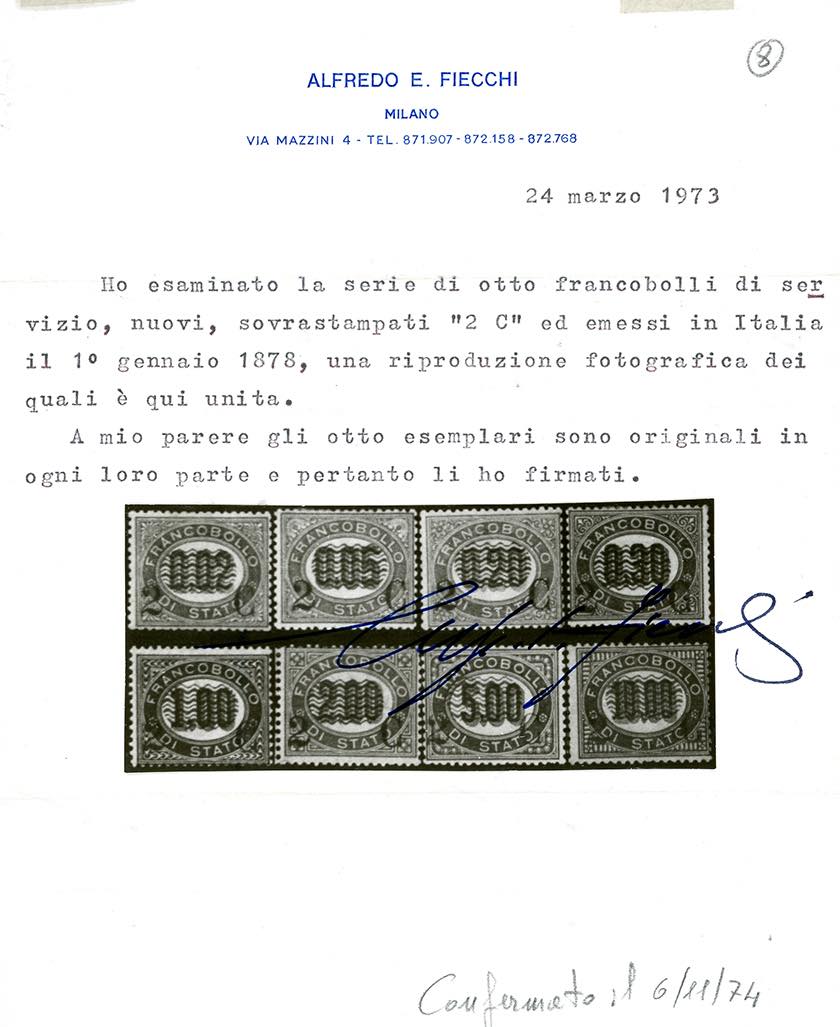 1878 - Servizio soprastampati, serie completa (29/36), discreta centratura, nuovi, gomma originale, perfetti. Cert. Fiecchi.