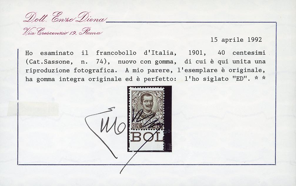 1901 - 40 cent. Floreale (74), bordo di foglio, nuovo, gomma originale integra, perfetto. Fiecchi, cert. E.Diena.
