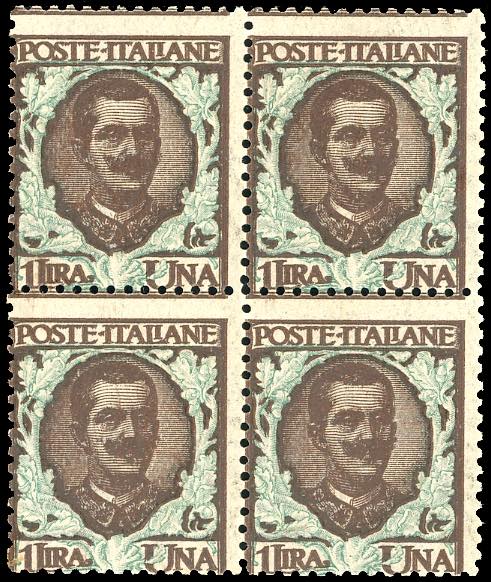 1901 - 1 lira Floreale, doppia stampa del bruno (77b), blocco di quattro, nuovo, gomma originale, integra per due esemplari, perfetto. ... Leggi tutto