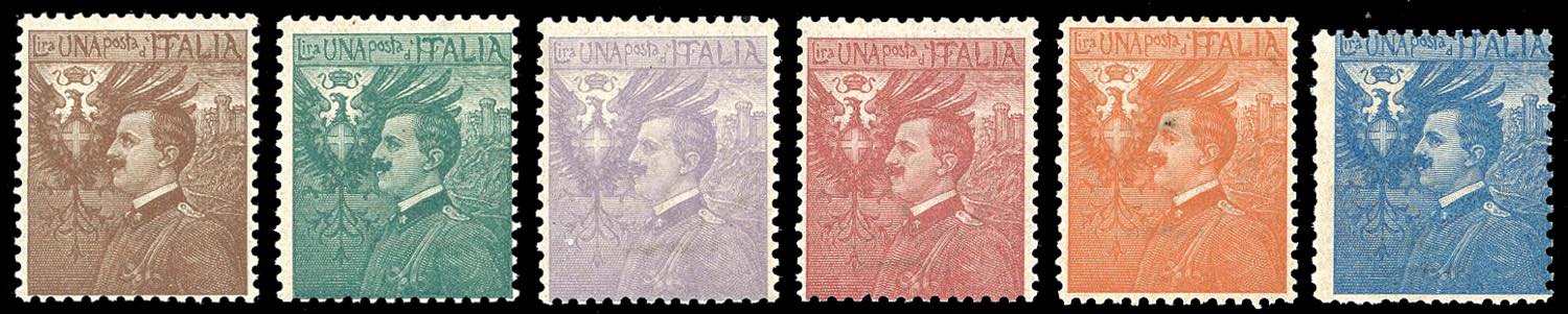 1905 - 1 lira saggi Michetti, serie completa di sei valori in colori differenti (Unificato 79N), nuovi, gomma originale, perfetti. Molto rari, solo poche serie esistenti. Cert. E.Diena.