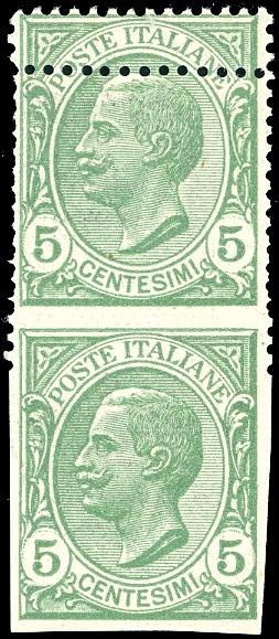 1906 - 5 cent. Leoni, coppia verticale, l'esemplare inferiore non dentellato, quello superiore con doppia dentellatura, doppio pettine (81mb), gomma originale integra, perfetta. Varietà molto rara. Raybaudi, cert. Ferrario.