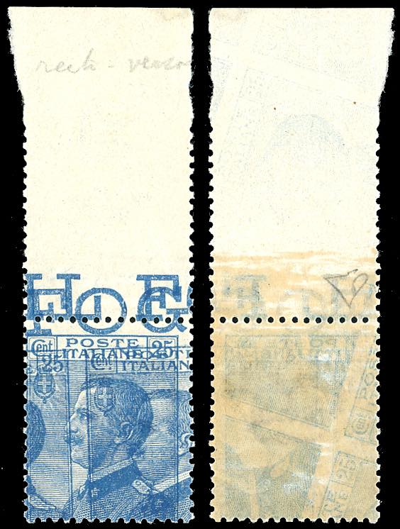 1908 - 25 cent. Michetti, tripla stampa di cui una al verso (83ca), bordo di foglio, nuovo, gomma originale integra, perfetto. Raro. Cert. E.Diena.