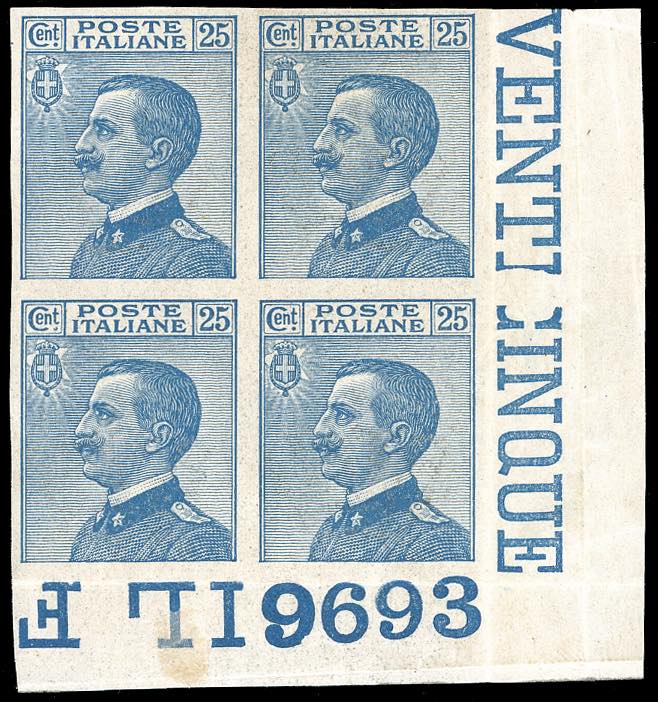 1908 - 25 cent. Michetti, non dentellato (83e), blocco di quattro, angolo di foglio con numero di tavola, nuovo, gomma originale per i due esemplari superiori, integra per quelli inferiori, perfetto. Raybaudi.
