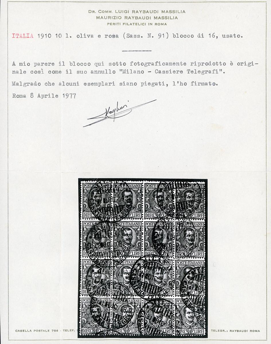 1910 - 10 lire Floreale (91), blocco di 16 esemplari, usato a Milano 31/12/1929, buono/ottimo stato. Molto raro, uno dei massimi multipli usati di questo francobollo. Cert. Raybaudi.