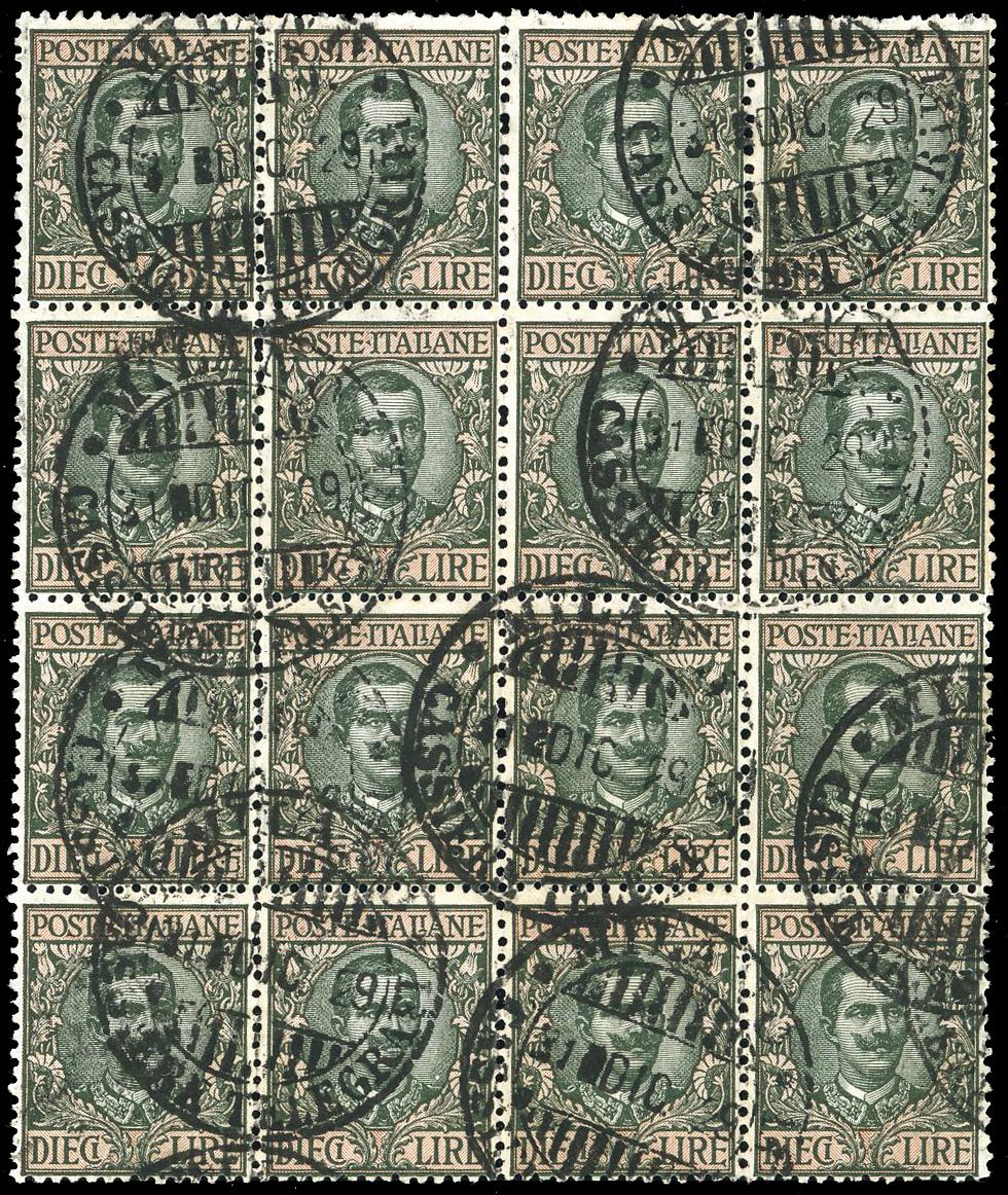 1910 - 10 lire Floreale (91), blocco di 16 esemplari, usato a Milano 31/12/1929, buono/ottimo stato. Molto raro, uno dei massimi multipli ... Leggi tutto
