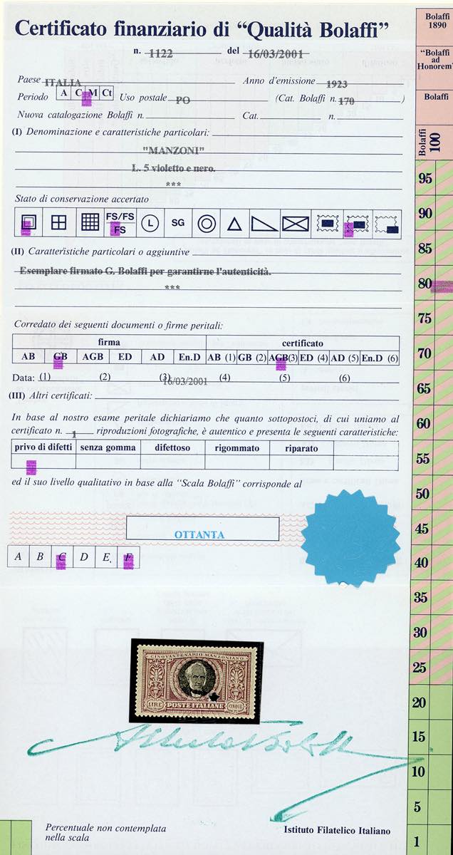 1923 - Manzoni, serie completa (151/156), nuovi, gomma originale integra, perfetti. Molto freschi. Il 5 lire, ben centrato, firmato G.Bolaffi e cert. Finanziario Bolaffi 80%.