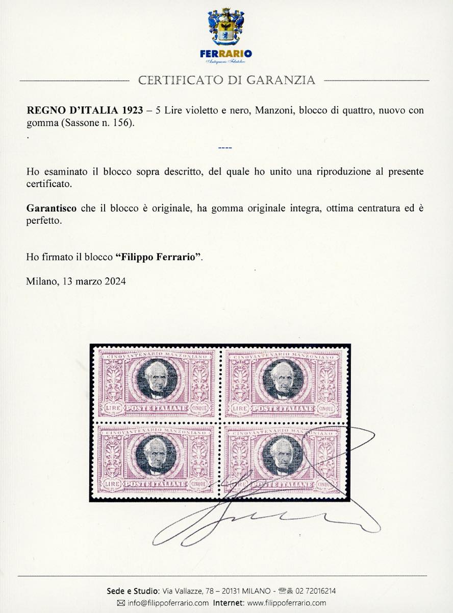 1923 - 5 lire Manzoni, blocco di quattro (156), nuovo, gomma originale integra, perfetto. Splendido e ottimamente centrato, qualità lusso. Cert. Cilio e Ferrario.