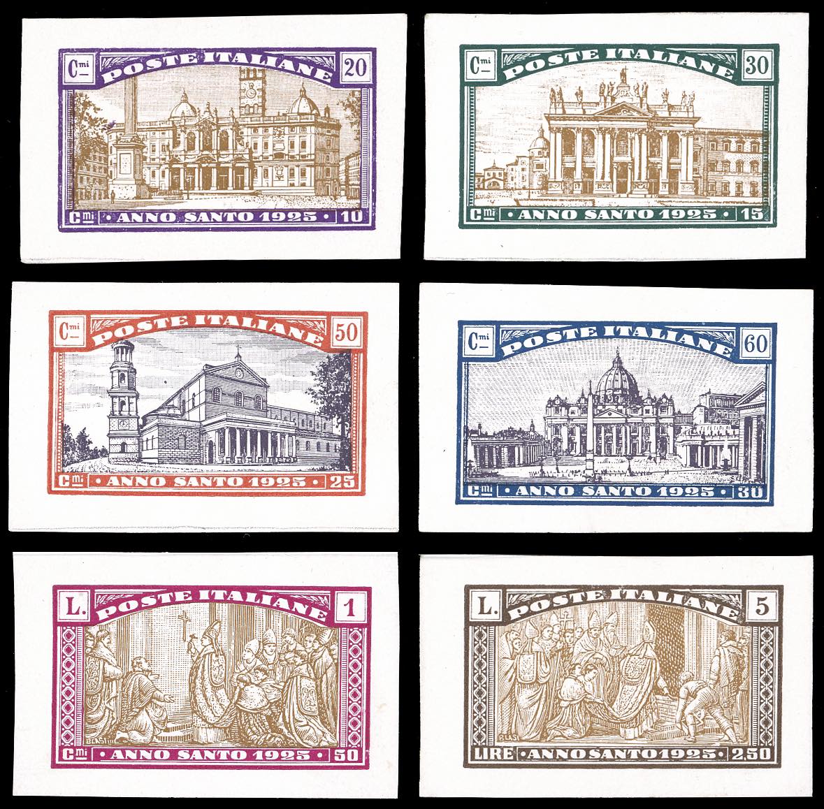1924 - Anno Santo, serie completa, prove su carta gessata, non gommate, colori invertiti rispetto alla serie emessa (169/174), perfette. Molto belle e rare. Ferrario.