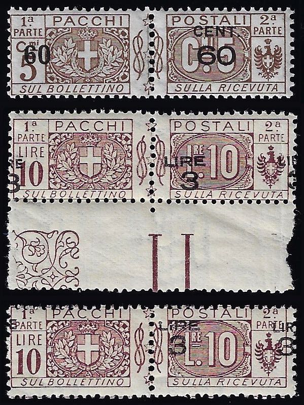 1923 - Tre esemplari con varietà di soprastampa (23h e due varietà non catalogate), gomma integra, traccia di linguella per un valore.
