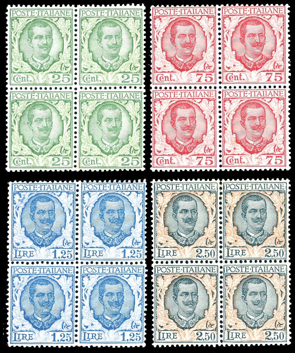 1926 - 25 cent., 75 cent, 1,25 e 2,50 lire Floreale, serie completa (200/203), blocchi di quattro, ben centrati, gomma originale integra, perfetti. Rari di questa qualità. Cert. Ferrario.