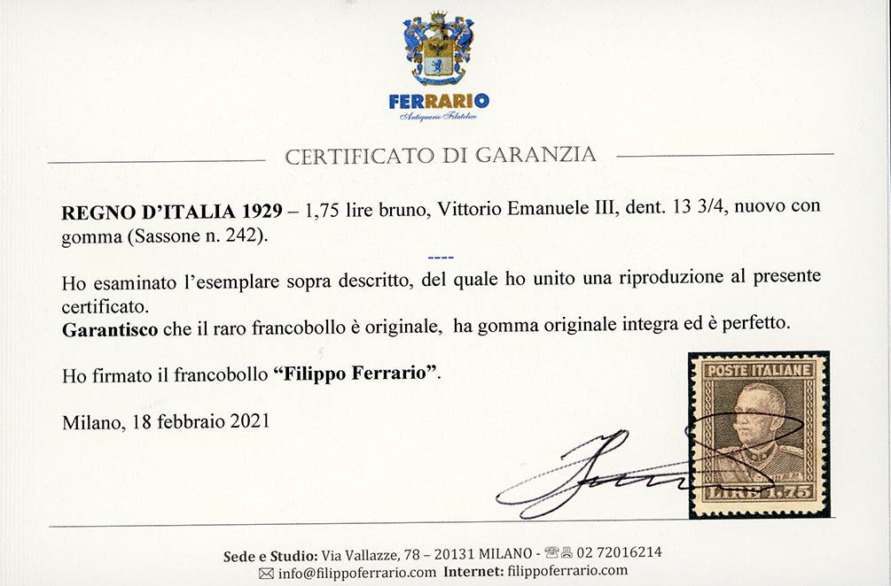 1929 - 1,75 lire bruno Vittorio Emanuele III, dent. 13 3/4 (242), nuovo, gomma originale integra, perfetto e molto fresco. Ottima qualità, molto raro. Cert. A.Diena e Ferrario.