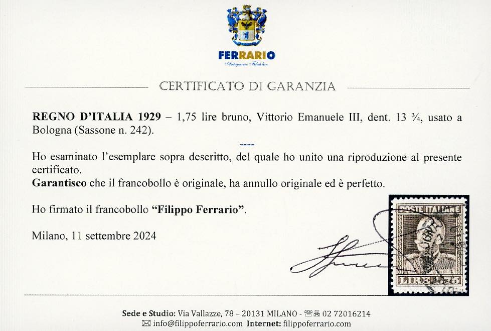 1929 - 1,75 lire bruno Vittorio Emanuele III, dent. 13 3/4 (242), buona centratura, usato a Bologna, perfetto. Ottima qualità. Cert. Ferrario.