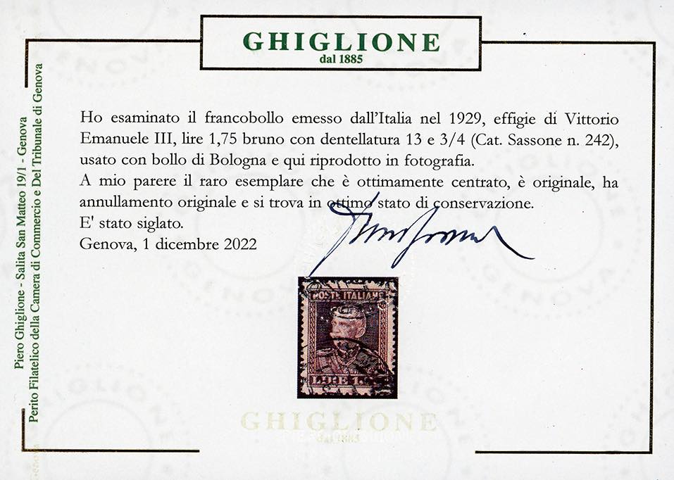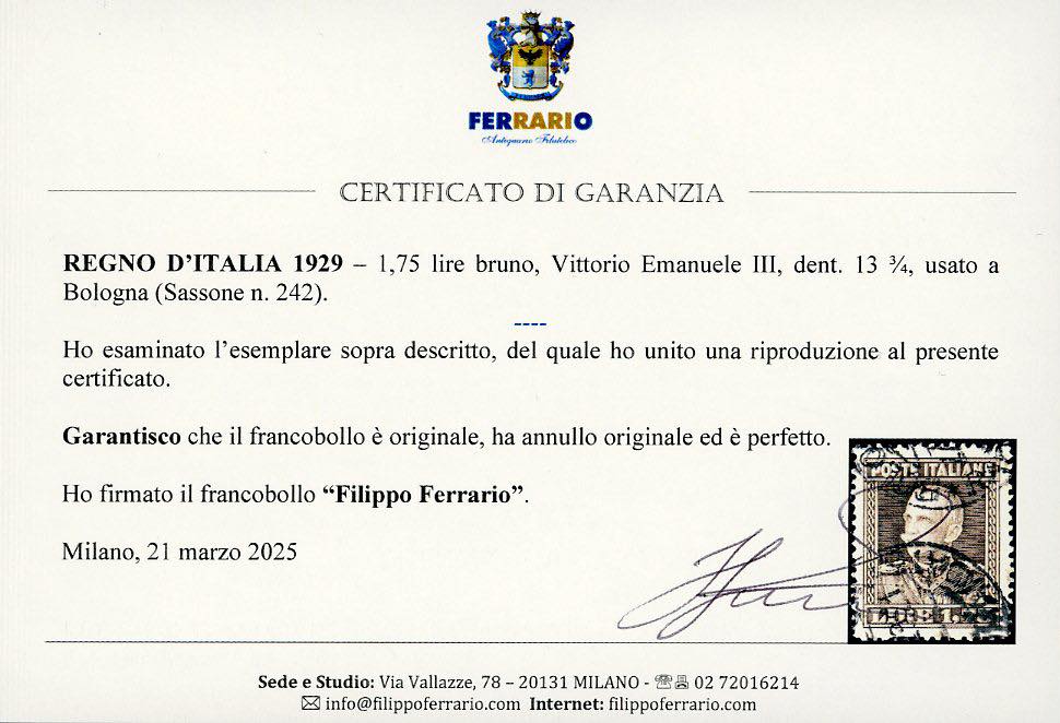 1929 - 1,75 lire bruno Vittorio Emanuele III, dent. 13 3/4 (242), ottima centratura, perfetto, usato a Bologna. Cert. Ghiglione e Ferrario.