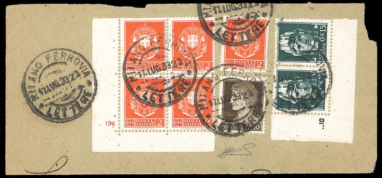 1930 - 2 cent., blocco di quattro, angolo di foglio con numero di cilindro, e singolo, 10 cent., 15 cent., coppia orizzontale, angolo di foglio con numero di cilindro, Imperiale (242A,245,246), perfetti, usati su frammento a Milano 17/7/1933. Molto raro l'uso di due numeri di cilindro diversi sullo stesso documento. Ferrario.