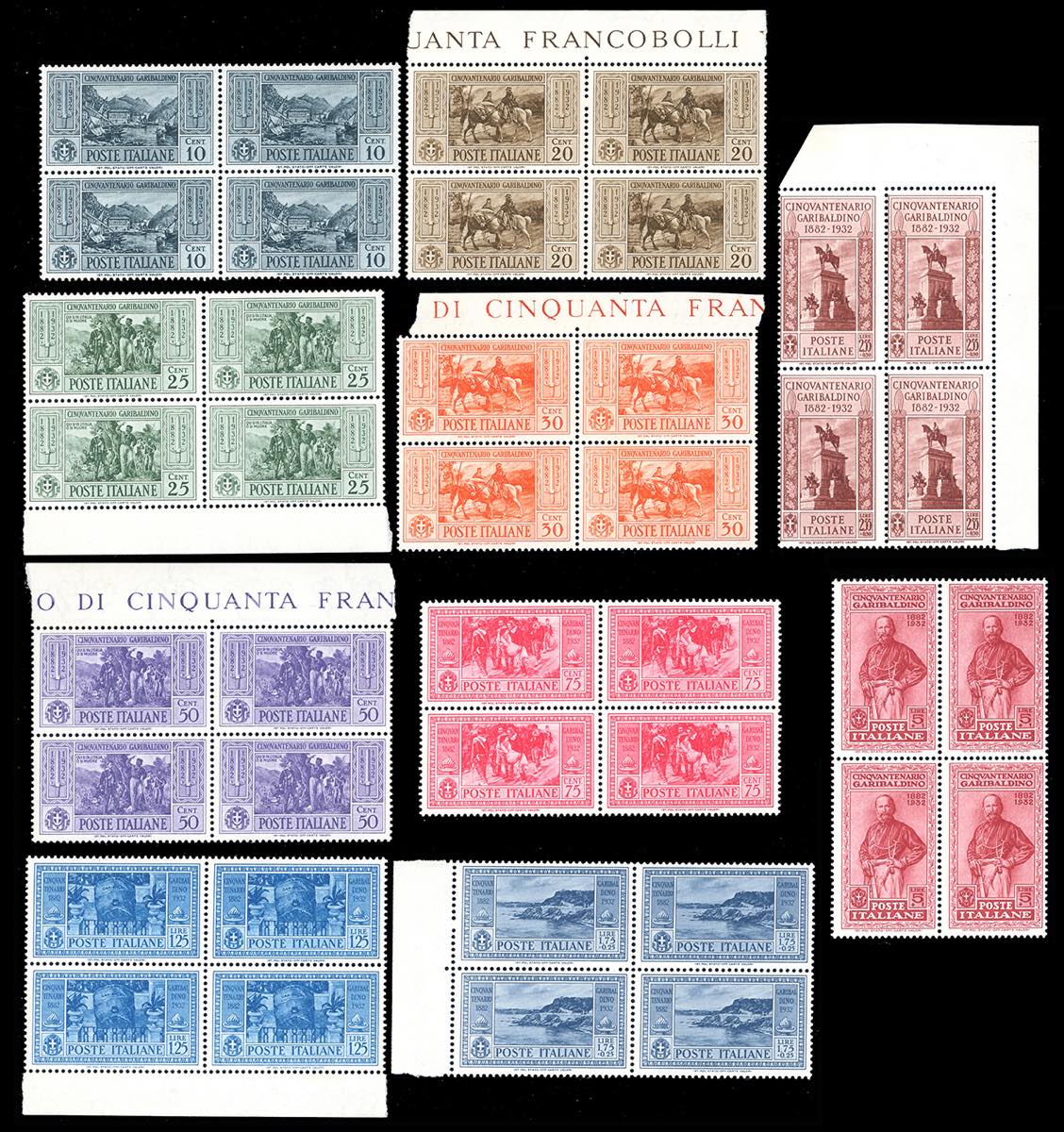 1932 - Garibaldi, serie completa di posta ordinaria (315/324), blocchi di quattro, gomma originale integra, perfetti. Ottima qualità.