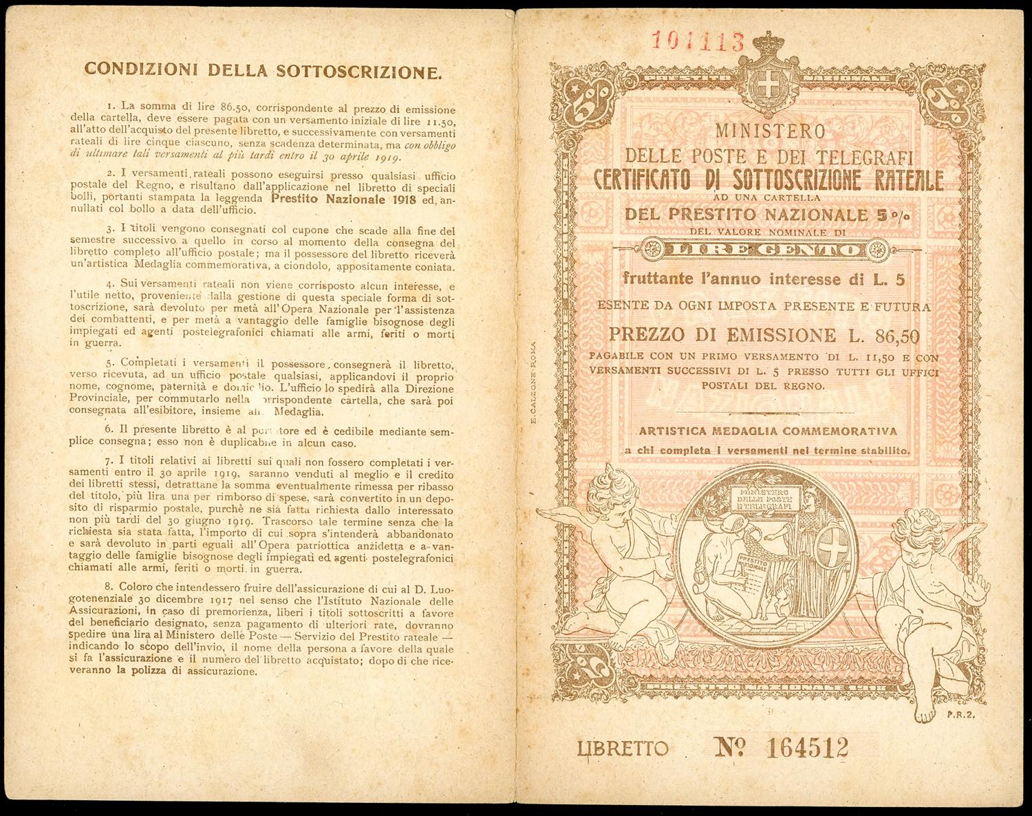 PRESTITO NAZIONALE 1919 - 5 lire soprastampato "Prestito Nazionale 1918" (Unificato 3), quindici esemplari, perfetti, su libretto completo del Prestito Nazionale annullati a Napoli 4/4/1919. Molto raro e di ottima qualità. Ferrario.