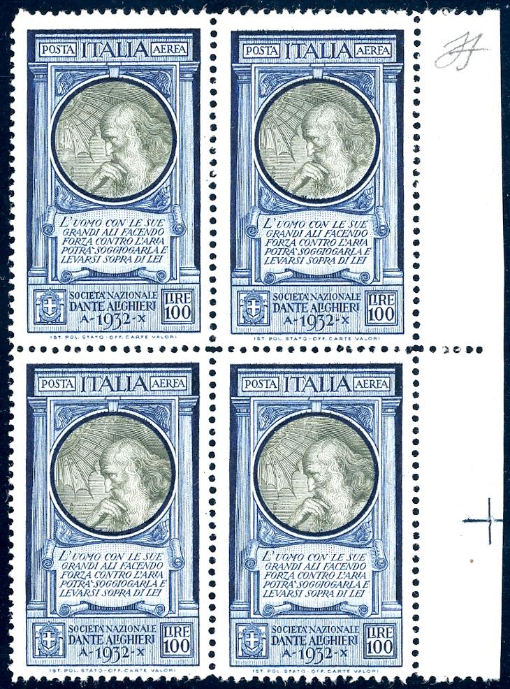 1932 - 100 lire Dante (41), ottima centratura, blocco di quattro, bordo di foglio, gomma originale integra, perfetto e molto fresco. Ferrario.
