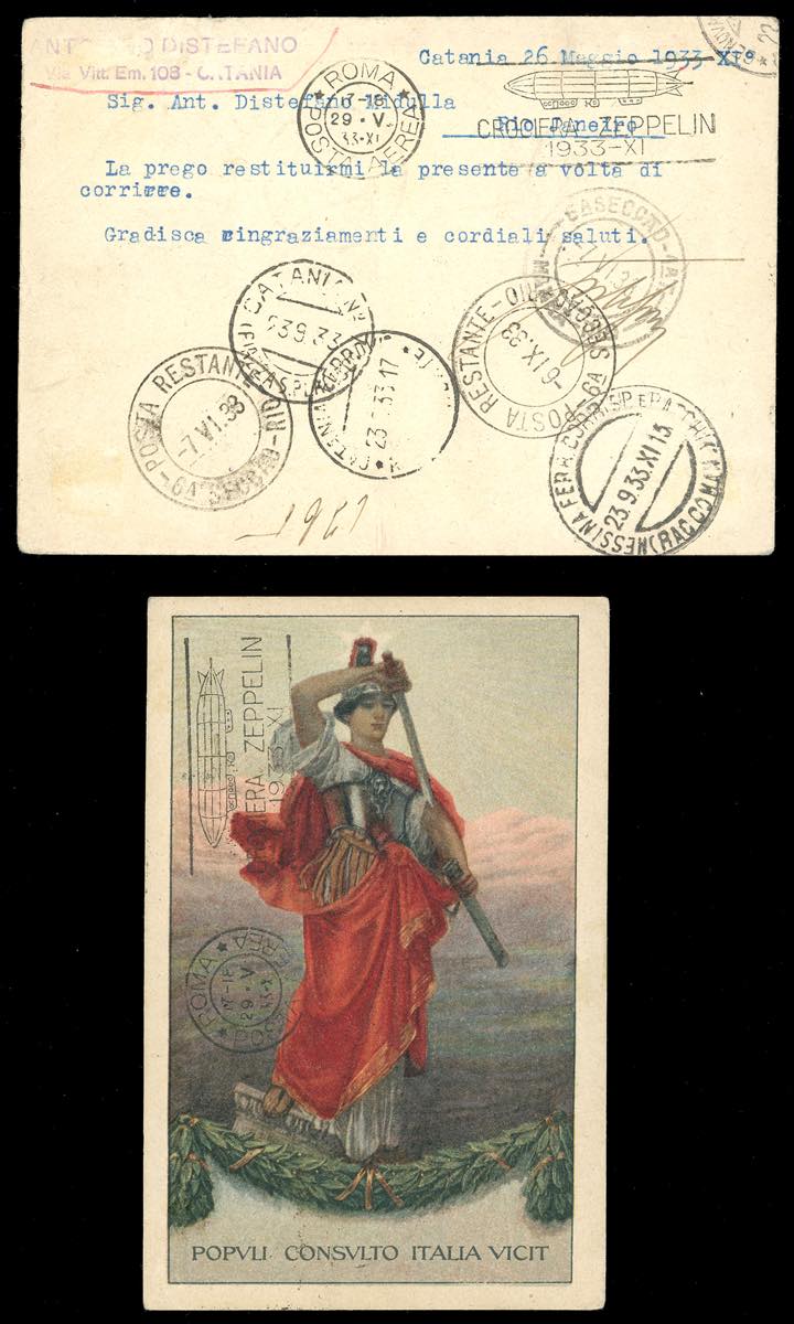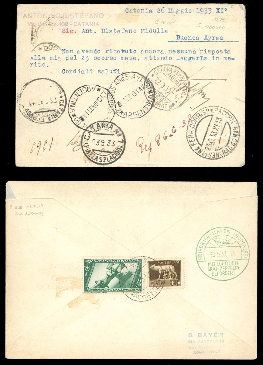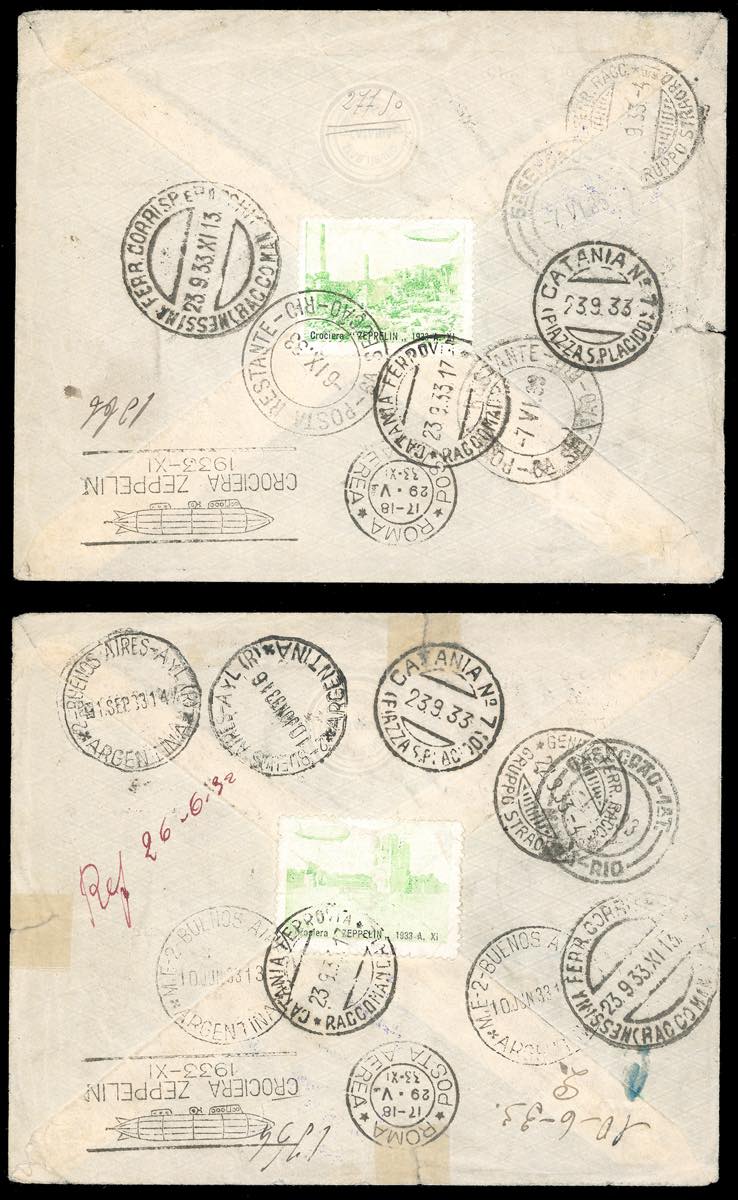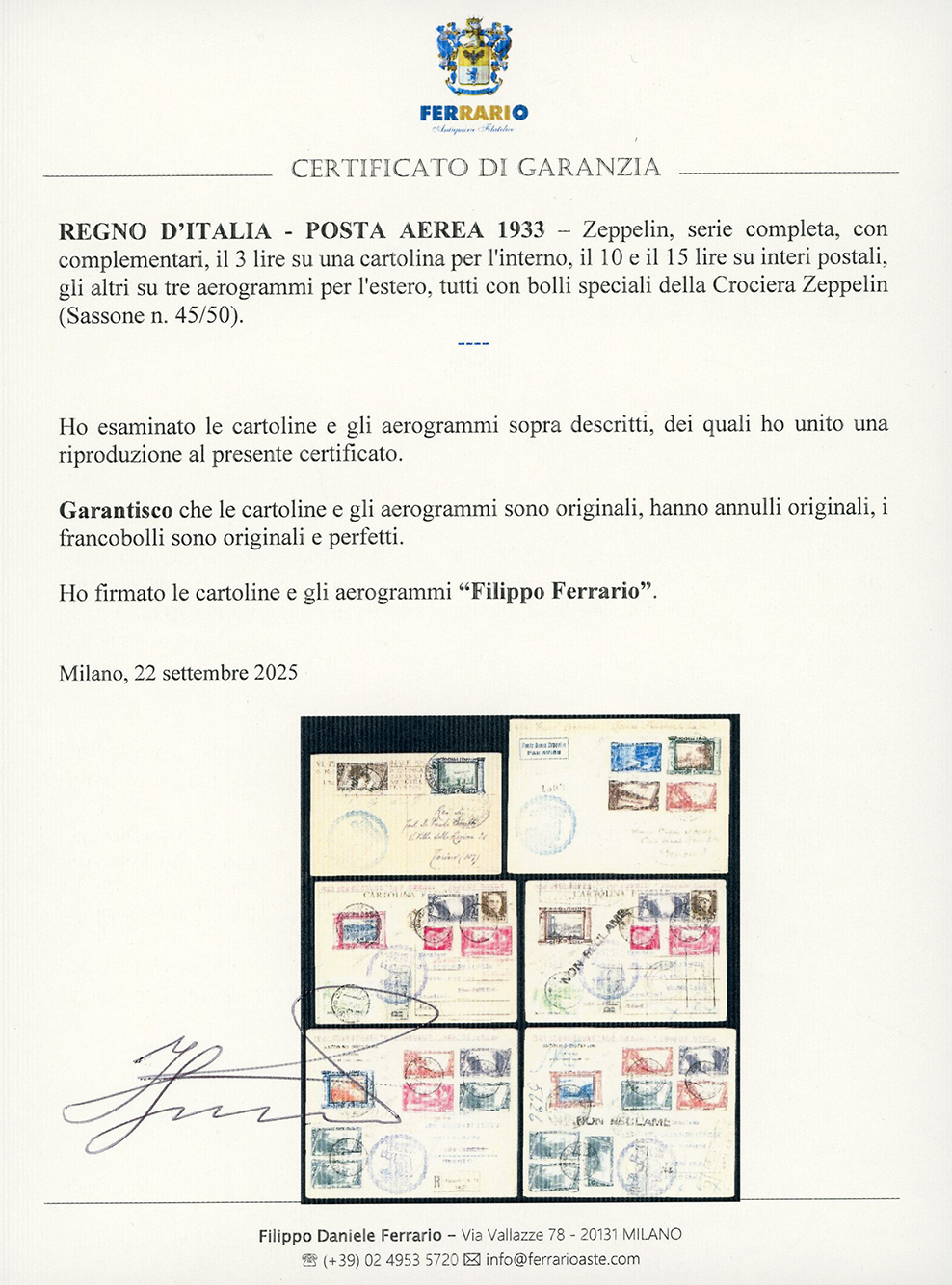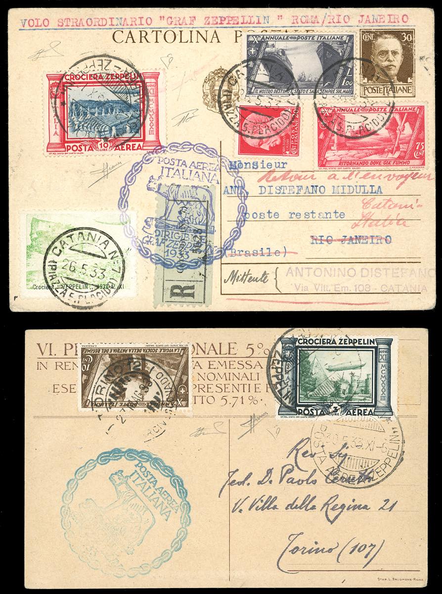 1933 - Zeppelin, serie completa (45/50), perfetti, con complementari, il 3 lire su una cartolina per l'interno, gli altri su cinque aerogrammi per l'estero, tutti con bolli speciali della Crociera Zeppelin. Insieme raro. Firmati da noti periti: Enzo Diena, Fiecchi, Sorani, cert. Ferrario per tutti.