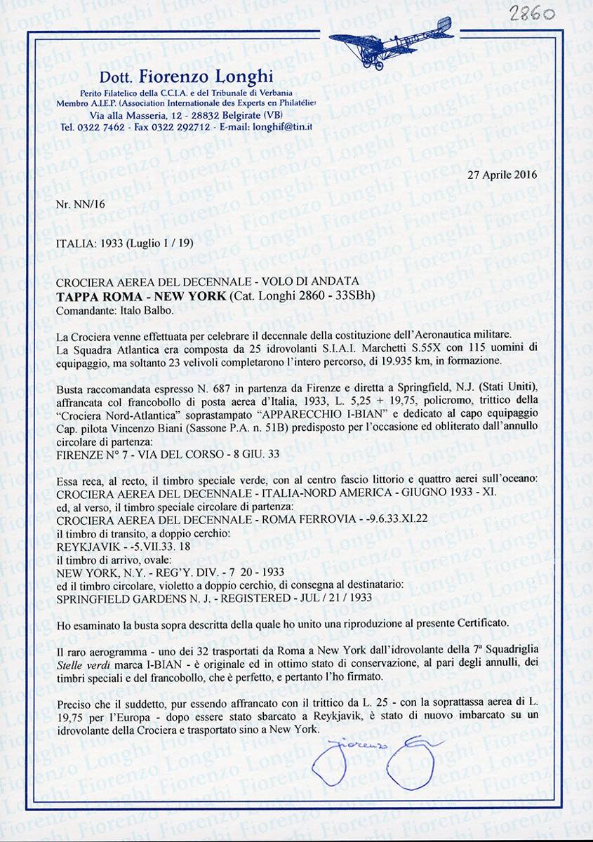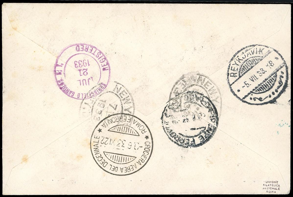 1933 - 5,25 + 19,75 lire Trittico I-BIAN (51B), perfetto, su aerogramma raccomandato da Firenze 8/6/1923 per gli Stati Uniti, via Reykjavik e New York, bolli speciali commemorativi della Crociera sul fronte e al verso. Interessante e raro trittico in tariffa per l'Europa ma giunto fino in America. A.Diena, Ferrario, cert. Longhi.