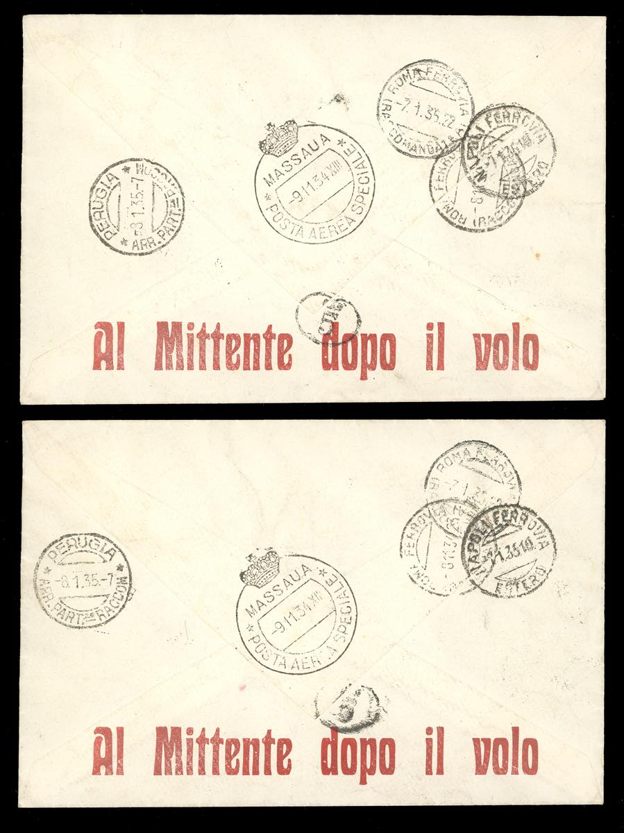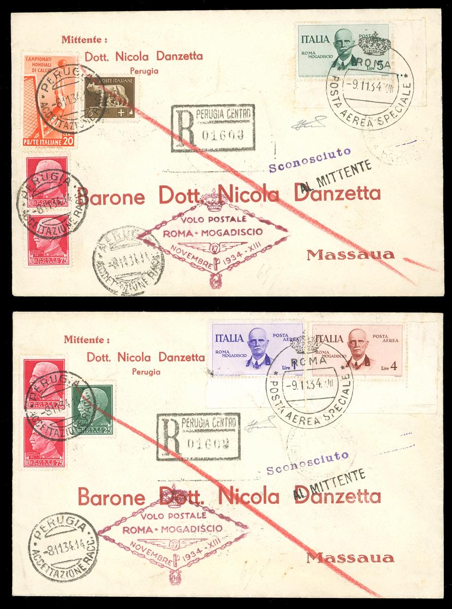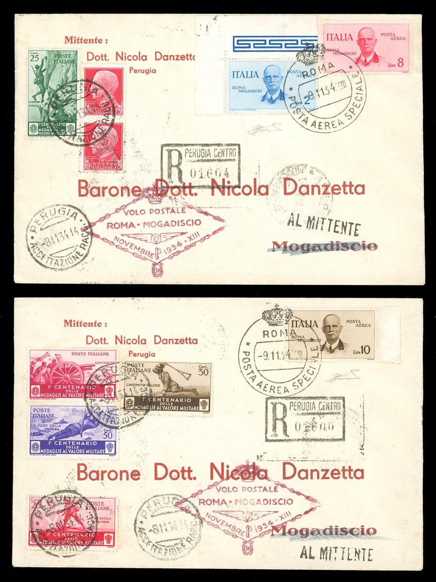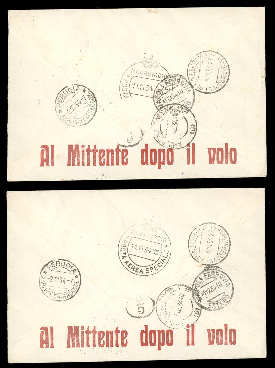 1934 - Volo Roma-Mogadiscio, serie completa (83/88), con complementari, su quattro aerogrammi raccomandati da Perugia 8/11/1934 a Mogadiscio, rispediti al mittente, bolli speciali del volo sul fronte e transiti al verso. Insieme non comune. Cert. Ferrario.