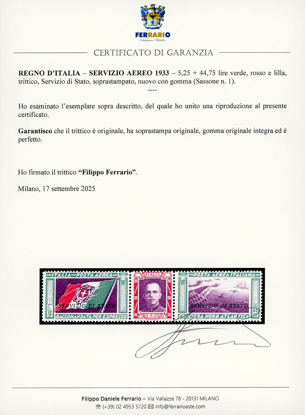1933 - 5,25 + 44,75 lire Trittico Servizio di Stato (1), nuovo, gomma originale integra, perfetto. Molto fresco. Ferrario.