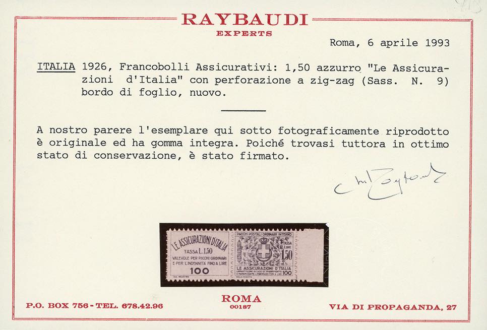 1926 - 1,50 lire Assicurazioni d'Italia (9), bordo di foglio, nuovo, gomma originale integra, perfetto e molto fresco. Francobollo raro e di ottima qualità. Cert. Raybaudi.